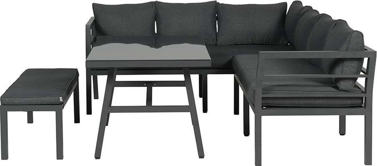 Op zoek naar een stijlvolle loungeset die nét even wat anders is dan anders? Dan is de Blakes lounge dining set van aluminium echt een uitstekende keuze. Een stijlvolle, volledig aluminium loungeset in de kleur grijs met comfortabele lounge kussens. Deze complete loungeset is vervaardigd uit onderhoudsvrij en weerbestendig aluminium met een stevige witte poedercoating.